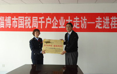 會上,舉行了授牌儀式,志賀進總經(jīng)理從婁局長手中接過了淄博市國稅局頒發(fā)的 “依法納稅 強國惠民” 的牌匾。